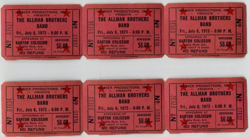 DescriptionA set of six tickects, numbers 07632-07637 to the Allman Brothers Band Friday night concert at Little Rock's Barton Coliseum. Addmision cost $6.00, and the concert was presented by Beaver Productions, Inc.Status