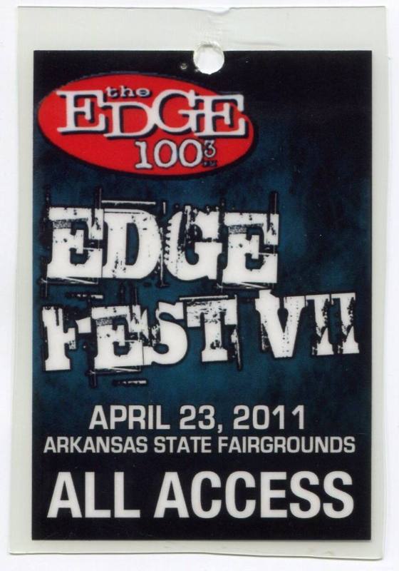 DescriptionAn all-access pass from the EDGE 100.3's Edge Fest VII at the Arkansas State Fairgrounds. Edge Fest VII was on Saturday, April 23, 2011. Bands at the festival included Avenged Sevenfold, Three Days Grace, Stone Sour, Seether, Theory of a Deadman, Skillet, Sevendust, Halestorm, Helmet, My Darkest Days, Art of Dying, and Russellville, Arkansas' own Dark from Day One.Status