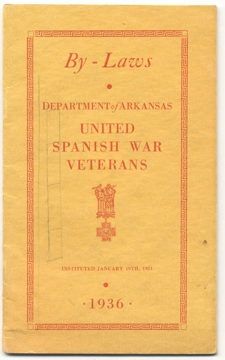 (b) "By-Laws United Spanish War Vetrens Auxilary Department of Arkansas instituted June, 1929 & 1941." 22 pages. Light brown cover with black print.