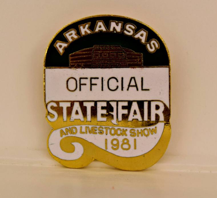 DescriptionA commemorative "OFFICIAL" pin from the Arkansas State Fair October 1981. The pin is metal with a gold finish, green and white background, a graphic of the Barton Colesium in the top register and reads, "Arkansas State Fair and Livestock Show." The bottom of the pin has a flourish.Status