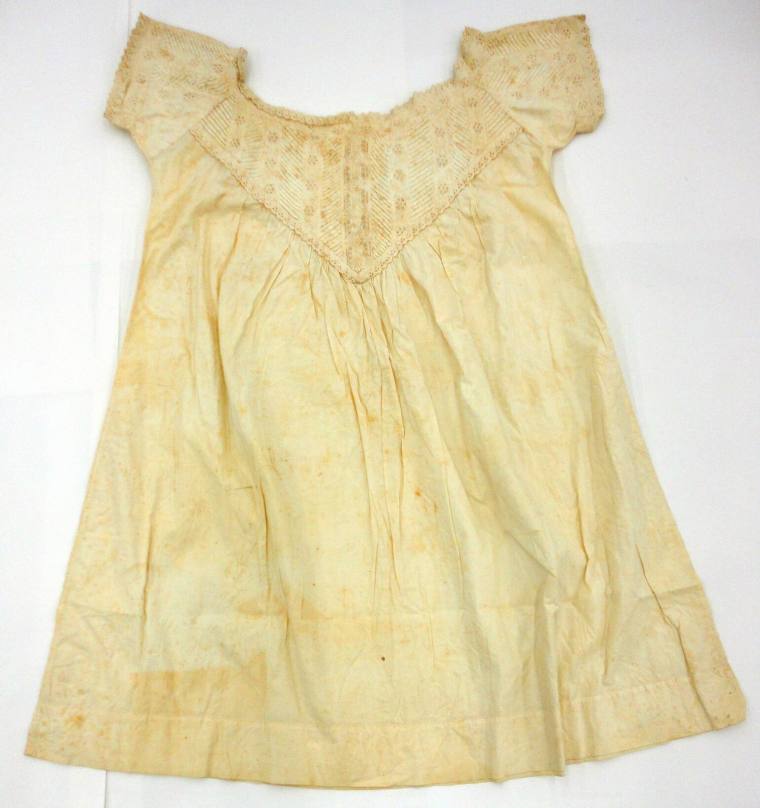 DescriptionChild's white dress with short sleeves. Collar, sleeves, and bodice all have eyelet, floral embrodiery with scalloped edge trim. Many small pleats in bands alternating with bands of embrodiery (down back as well). Three buttons down the back.