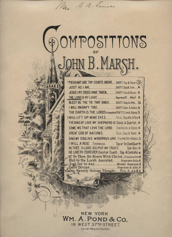 Composer's name with a list of his other compositions backed by an illustration of church. All lettering done in black ink. Signature at the top - Mrs. H.A. Turce. Left edge has been taped, Back of last page starts a different song, "Perfect Peace" (I heard a Voice)