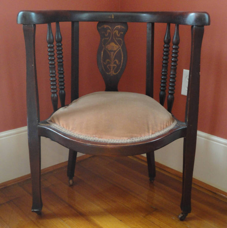 DescriptionDark mahogany barrell in shape-captain's chair with inlaid wood (single inlay with tendrils) and a center urn-shaped splat that has an orange painted design and two turned spindles on either side. Chair's bottom is upholstered in rose velvet. Chair sits on four wooden casters.