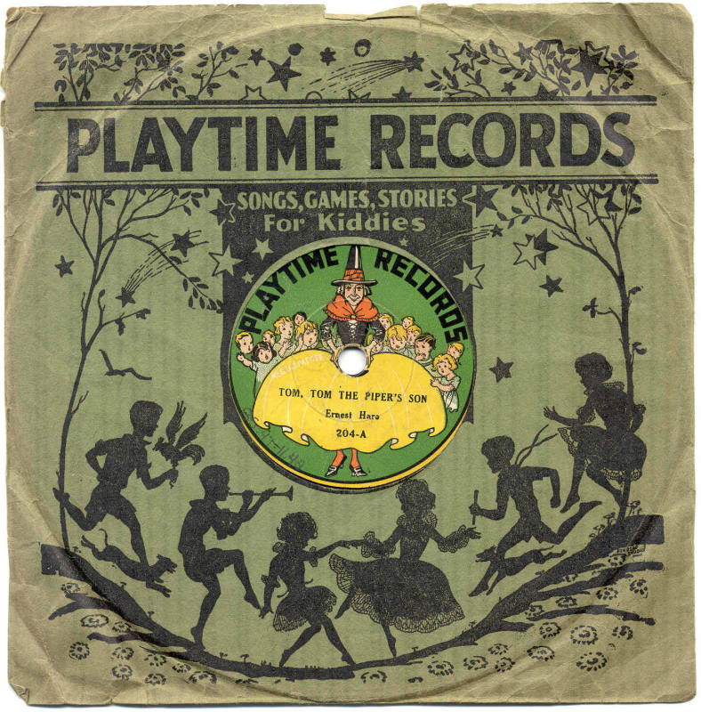 Side A: Numbers 103-204A and 9923-3 stamped on rim around label. Label reads: "Playtime Records, Tom, Tom the Piper's Son, Ernest Hara- 204A.". There is a imageof a woman in a yellow skirt surrounded by children on green background.