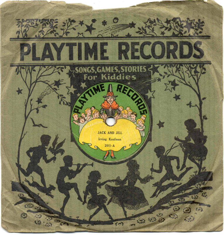 Side A: Label reads"Jack and Jill, Irving Kaufman, 201-A." With image of woman in yellow skirt, surrounded by children on green background. The numbers 9924-3 and 100A201 are stamped on rim around label.