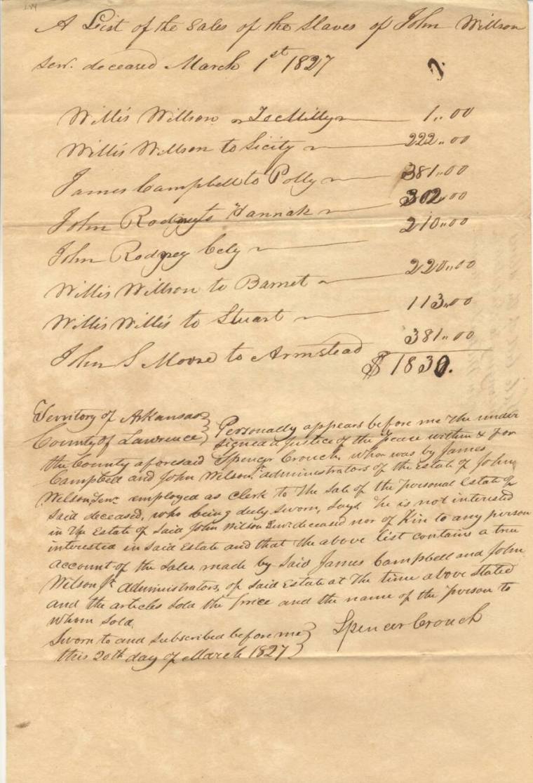 "A list of the sales of the slaves of John Wilson