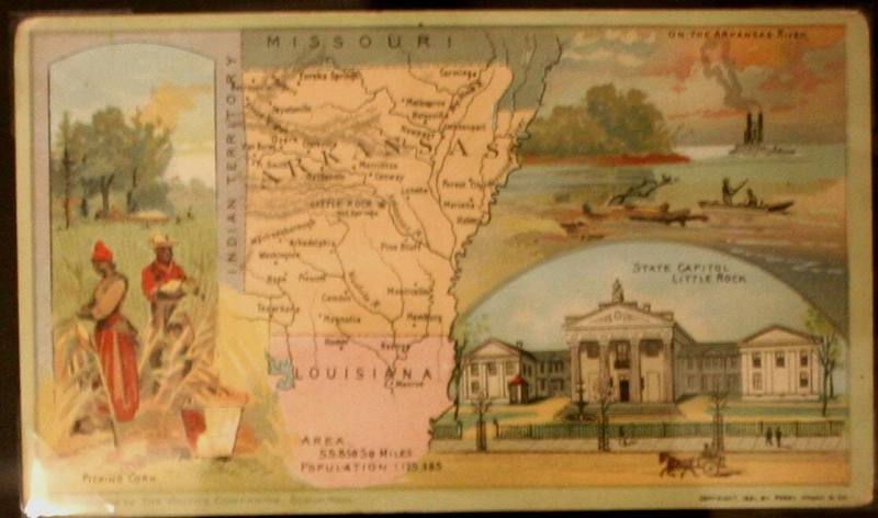 On reverse is a short desription and history of the state with facts about the state printed down the left hand side; ie. population and crops. The card was produced for the "Youth's Companion" series which gave facts and maps of each state. Made of paper and ink.