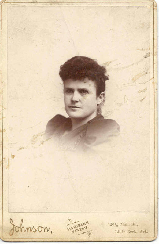 DescriptionBlack and white cabinet card photograph of Ina McKenzie Davis wearing dark dress with dark hair tied up in back, body turned slightly to left. Etched on bottom, "Johnson Parisian Finish 120 1/2 Main St., Little Rock, Ark."