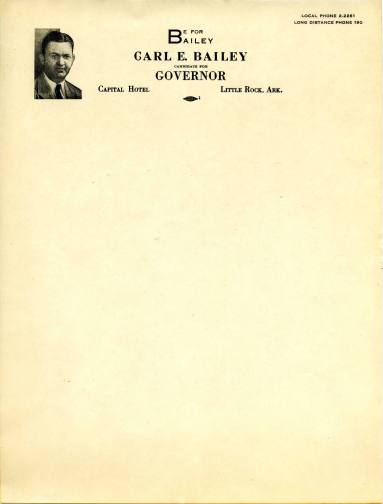Carl Edward Bailey was born on October 8, 1894 in Bernie, Missouri. Bailey married Margaret Bristol on October 10, 1915; they had six children. In 1922, Bailey was granted permission to practice law, and in 1924 he moved to Little Rock where he opened a private practice. Bailey was named Deputy Prosecuting Attorney in 1926, and in 1930 was elected the Prosecuting Attorney of the Sixth Judicial District. In 1934, Baily won the election for attorney general, and in 1936 he was elected governor. Bailey was reelected in 1938 and in 1940 he ran for an unprecedented third term, however, he lost to Homer Adkins. On October 23, 1948, Bailey died of a heart attack.