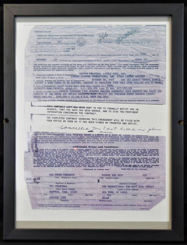 DescriptionA print of Lynyrd Skynyrd's contract for their October 22, 1977 concert at Little Rock’s Barton Coliseum. Included on the print is the handwritten note, "Cancelled. Van Zant killed in plane crash."On October 20, 1977, the plane transporting Lynyrd Skynyrd from South Carolina to Louisiana crashed, killing lead singer Ronnie Van Zant, guitarist Steve Gaines and vocalist Cassie Gaines.