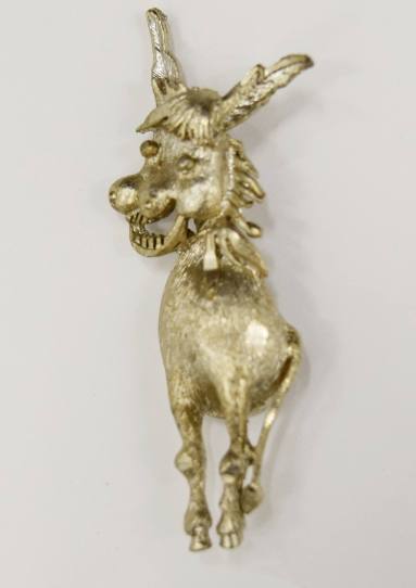 DescriptionMetal donkey pin belonging to Nancy Hall. The pin features inlaid mother of pearl in the torso of the donkey, as well as a brass-colored outer coating that has worn off over time.Nancy Johnson Hall (1904–1991) was the first woman in Arkansas to be elected to a constitutional office. Upon the death of her husband C.G. "Crip" Hall in 1961, she was appointed to serve the remainder of his term as secretary of state by Governor Orval Faubus. Hall then went on to be elected as Arkansas state treasurer in 1962, running unopposed in the general election as a Democrat. Hall served as treasurer for 18 years.