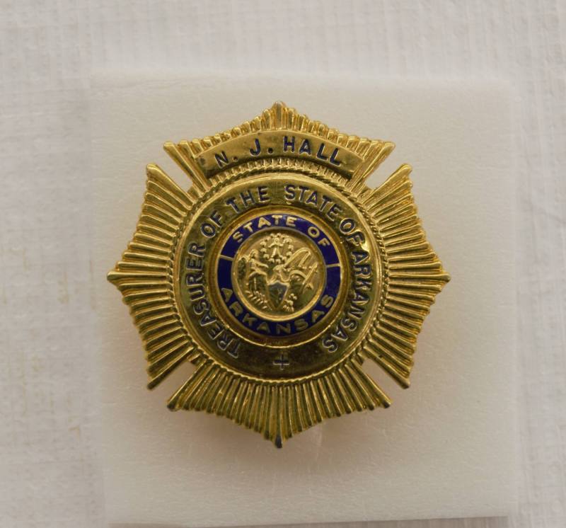 DescriptionTreasurer of State badge belonging to Nancy Hall. The badge is round with a point on four sides. Engraved in blue letters at the top is: "N.J. Hall" Around the center of the badge reads: "Treasurer of the state of Arkansas" In the center of the badge is the seal of the state of Arkansas in gold.Nancy Johnson Hall (1904–1991) was the first woman in Arkansas to be elected to a constitutional office. Upon the death of her husband C.G. "Crip" Hall in 1961, she was appointed to serve the remainder of his term as secretary of state by Governor Orval Faubus. Hall then went on to be elected as Arkansas state treasurer in 1962, running unopposed in the general election as a Democrat. Hall served as treasurer for 18 years.