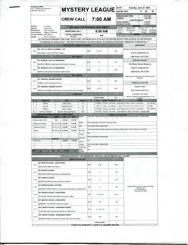 DescriptionCall sheet for the show Mystery League, Tuesday, June 27, 2023Status