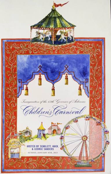 DescriptionA poster advertising the inaugural Children's Carnival, held on Sunday, January 8, 2023. The carnival, which was hosted by Scarlett, Huck and George Sanders, was one of the pre-inaugural events commemorating the inauguration of Sarah Huckabee Sanders as the 47th Governor of Arkansas.Status