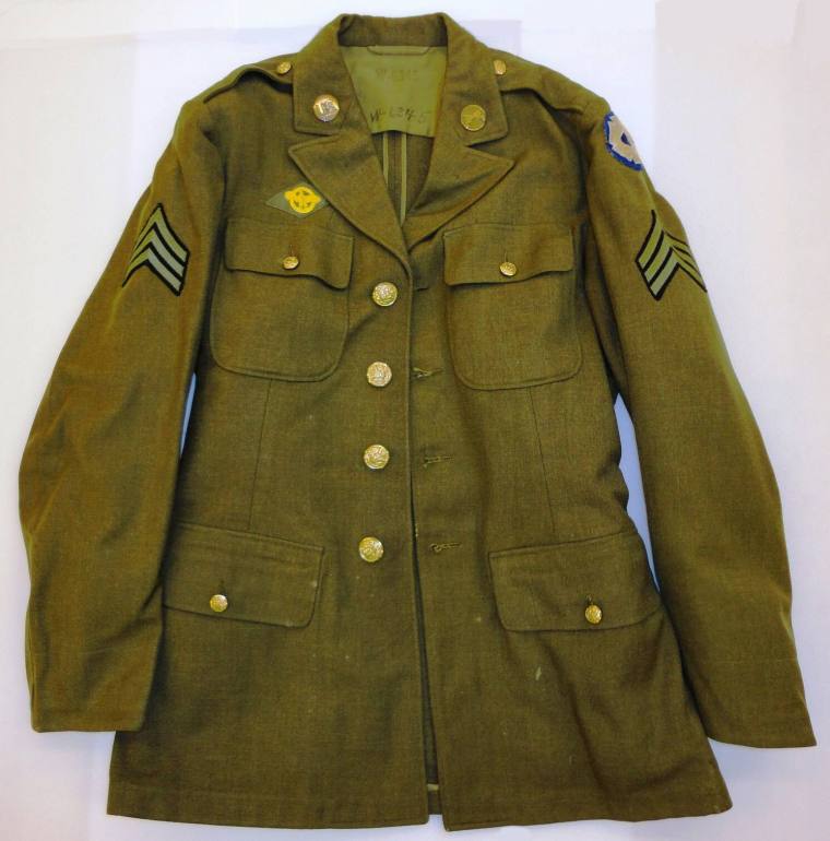 DescriptionGreen Jacket belonging to a Sergeant in Military police branch of Army. Four pockets with small brass buttons on each. Four large brass buttons down the front. Chevron Insignia on both upper sleeves. Additional blue and white insignia on left sleeve. Bright yellow eagle insignia above right breast pocket. Brass "US" pin on right collar. Brass Crossing pistols on left collar.