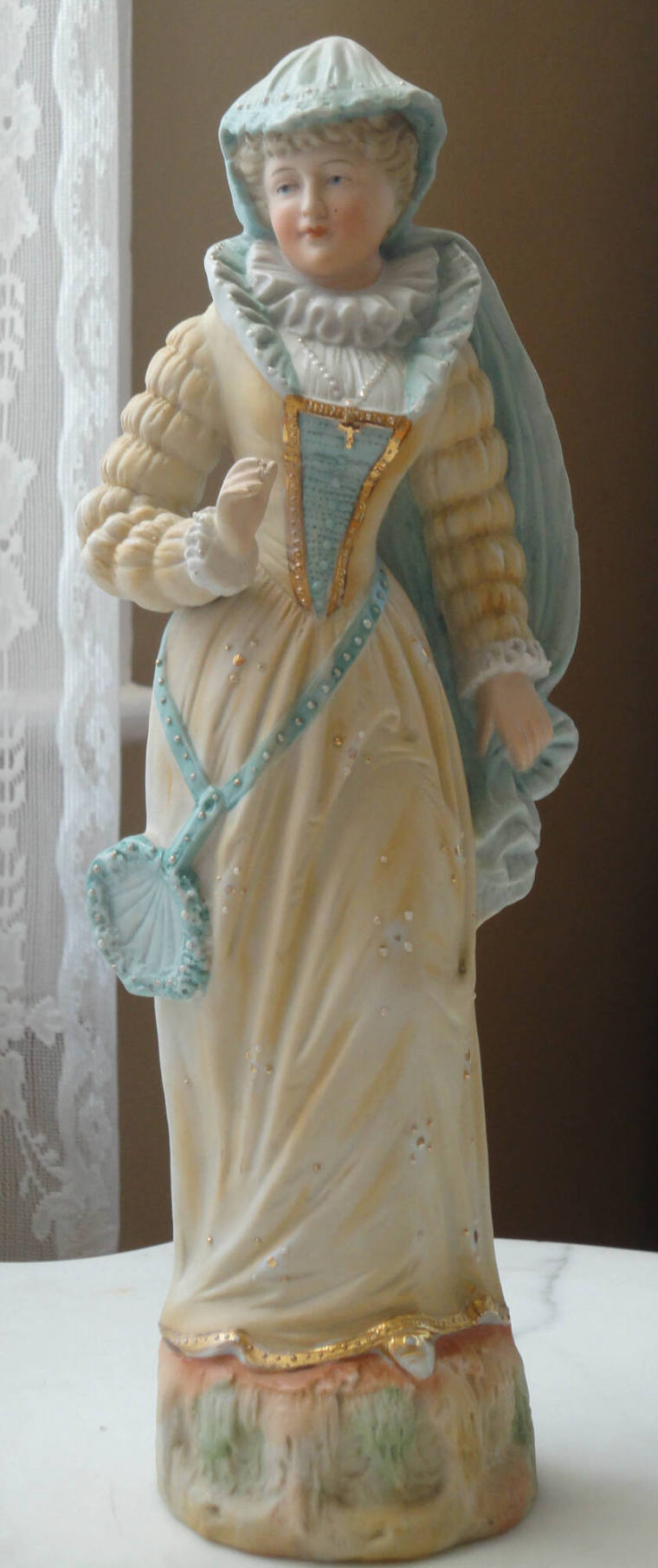 DescriptionA ceramic/porcelain hollow figurine of an Elizabethan-era woman. Woman is fashioned in high class-clothing that is primarily pastel colors of yellow, peach and blue, with a gold trim. Base has shades of coral that resembles the ground. Made in Germany.