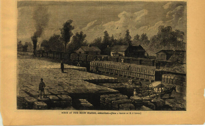 DescriptionWood engraved print entitled: "Scene at Pine Bluff Station, Arkansas" also brief documentary entitled "Pine Bluff Railway Station, Arkansas"