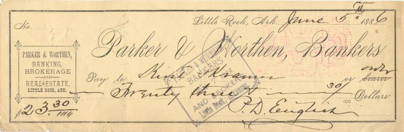 Stamped in red: Merchants Nat'l Bank, Paid, June 7, 1886, Little Rock, Ark.