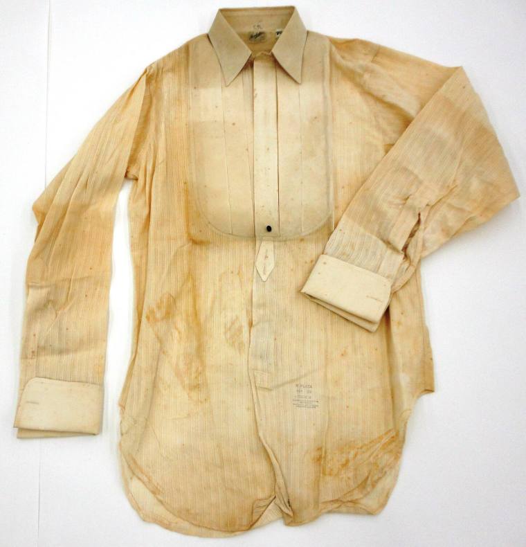 DescriptionFaded and stained white cotton shirt. Two big pleats on each side of front. Fastens in front with one medium white button at top and there's two sets of button holes on each side that's used to close shirt with a black snap type button (two missing) Initials "CJL" printed in ink back inside neck. Label "Manhattan"