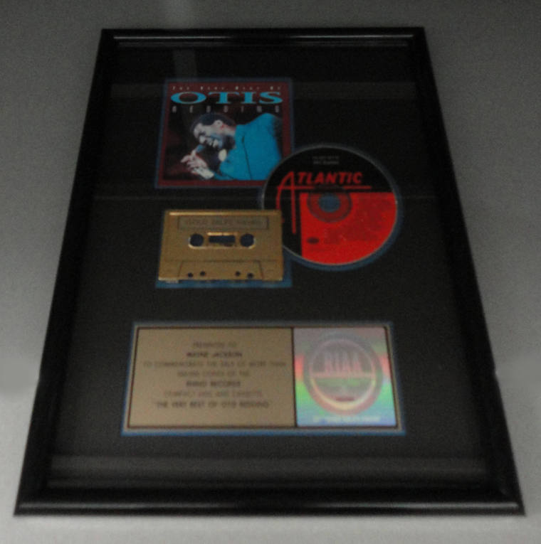 The award features a compilation of memorabilia including the album cover of "The Very Best of Otis Redding," a compact disc of the album, a gold cassette tape, and a commemoration plaque. The items are placed on a black mat and encased in a black frame. The award was presented by Recording Industry Association of America.