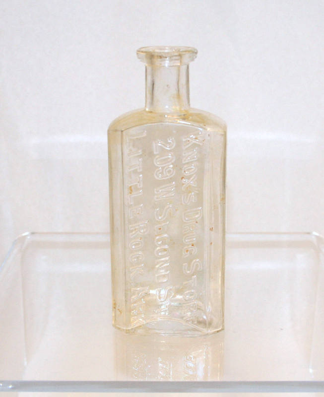 DescriptionClear glass medicine bottle from Knox's Drugstore, 209 W. Second St., Little Rock, Ark." Rectangular in shape. Ring turned lip over a tapering neck.Status