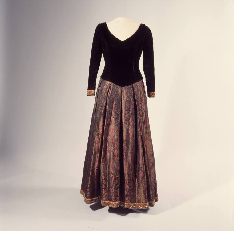 DescriptionThe gown worn by Betty Tucker during the Inauguration of Jim Guy Tucker as the Forty-third Governor of Arkansas on December 12, 1992. The gown is a one piece, full length gown made of black velvet and sequins. The bodice is velvet and comes together at a 'V' at the waist, neck, and back. The sleeves are long and narrow, with the cuffs displaying a sequined paisley pattern. The skirt is full and floor length with a heavy fabric decorated in a paisley print. The gown has pleats that fall from the waist and the hem matches the cuffs in color and theme. The skirt has a heavy netting underneath to aid in the fullness.Status