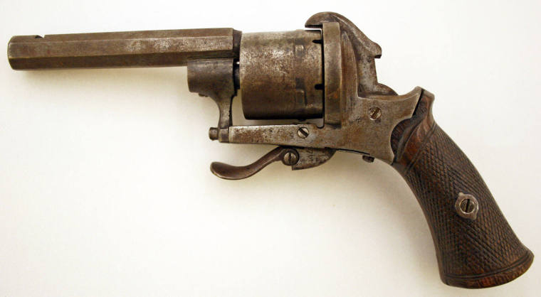 DescriptionRevolver - Pin-fire, cartridge, double action. Bullet chamber holds up to six bullets. Handle is made of wood in two halves. Bullets are loaded one at a time on right side of chamber. A Belgium proof mark appears on the barrel. Trigger is retractable.