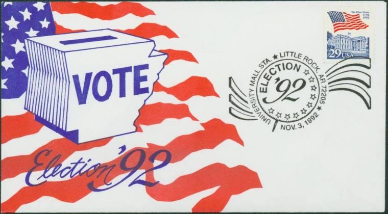 DescriptionEnvelope with 29 cent American flag/white house stamp cancelled at University Mall Station Little Rock, AR with the date 11/3/95. On the left hand side is a picture of AR in the shape of a voters' box against an American flag background. Under the voters' box is, "Election '92."Good Condition