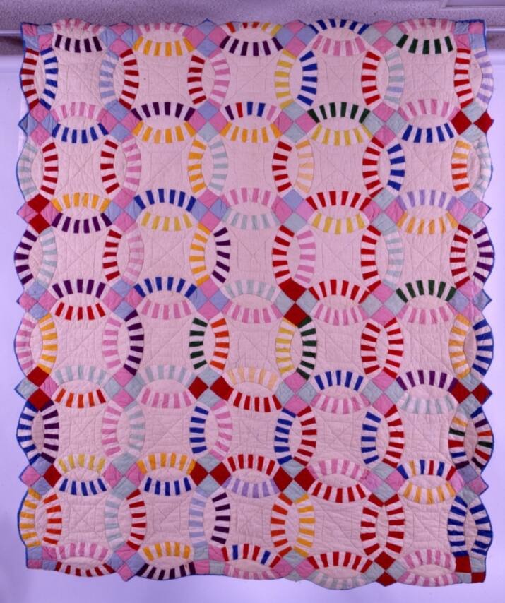 DescriptionA quilt featuring a double wedding ring pattern made by Essie Jackson. The quilt is hand quilted, top hand-pieced, the backing is 15" electric blue cotton, attached to top with white thread, edges scalloped with points, medium batting, five stitches per inch, no separate binding, with two piece backing.