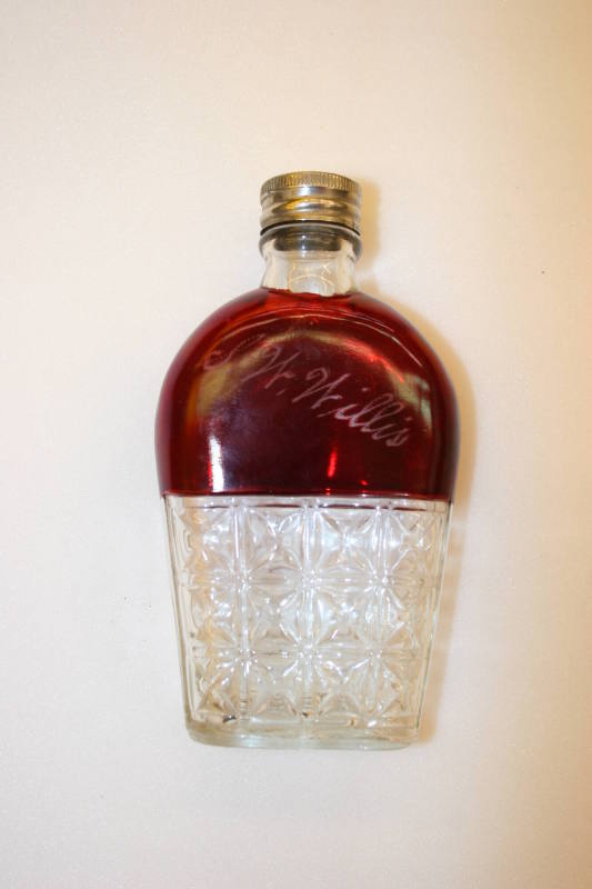 DescriptionSix inch whiskey bottle. with aluminum cap. Upper half of bottle, excluding neck is tined red. Scratched through the tint is "S.W. Willis." Lower half of the bottle is decorated with. Cap has minor tarnish but rest is in good condition.
