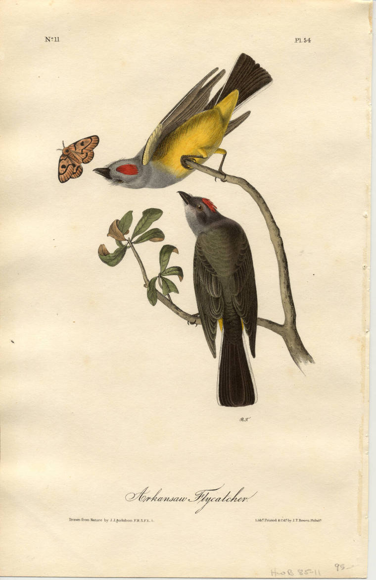 DescriptionColored lithographic print of two Arkansas flycatchers perched on a tree limb. Birds have red streak on their crowns, grayish heads, yellow bellies. Print is no. 11, plate 54.Status