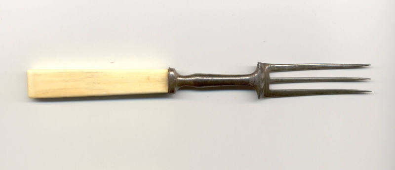 DescriptionDinner fork with ivory handle has square edges and rounded ends. Has 3 pointed tines about the same length as the handle.Status