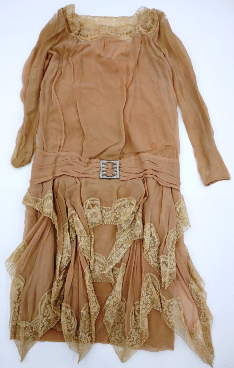 DescriptionCreme colored chiffon dress with sash around the hips and silver buckle with brillants, lace and embroidery trim around square neckline and skirt. Swiss made.Belonged to Miss Marie Lloyd, born 1889, died 1987. Daughter of Jimmie Wright Lloyd and James Turner Lloyd. Was State Regent of the D.A.R., very active in the Old State House and restoring the D.A.R. room. Lived in Little Rock, born in Pine Bluff.