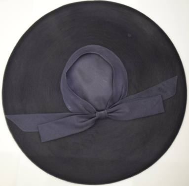 DescriptionStraw boater hat with 2" wide brim. Navy grossgrain ribbon decorates hat with flat bow on one side. Three small yellow lines accent the ribbon's center. Made by Penn Craft Hat Co.Status