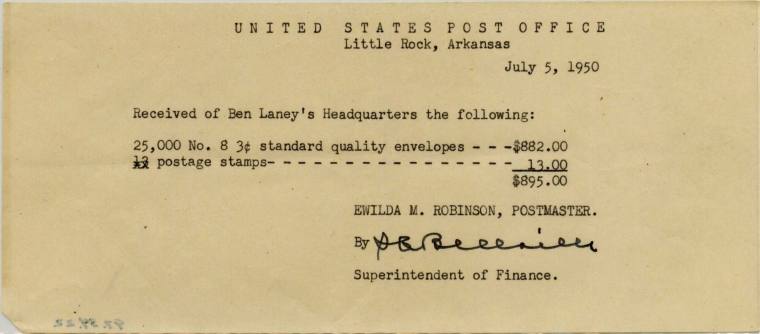 DescriptionPostal receipt for 25,000 No.8 standard quality envelopes and stamps at a total cost of $885.00 for Ben Laney Campaign Headquarters. Date: July 5, 1950.Ewilda M. Robinson, Postmaster. Signed By I.C. Bellville, Superintendent of Finance.