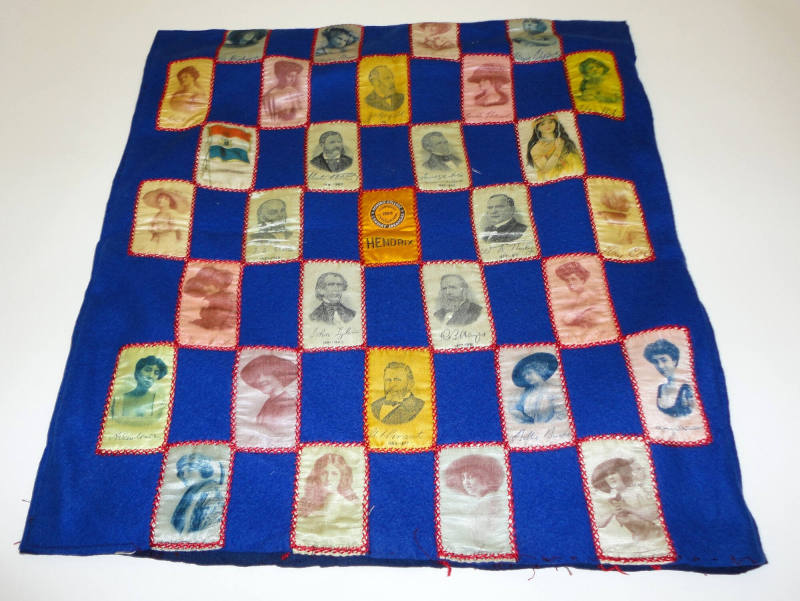DescriptionNavy blue felt pillow cover with cigarette silks featuring actresses and U.S. presidents. A yellow Hendrix College patch is in the center. Silks are stitched to cover in red - bottom edge is open.Status
