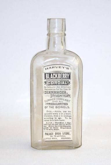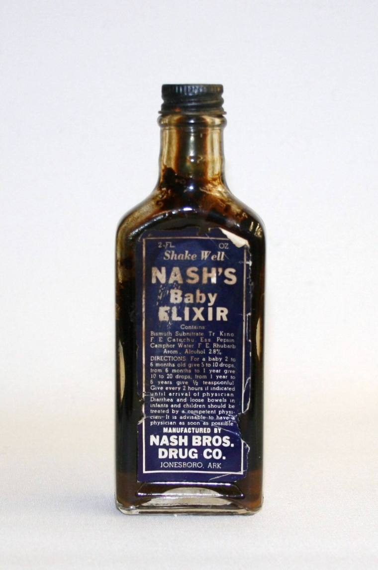 DescriptionGlass medicine bottle of Nash's Baby Elixer from the Nash Bros. Drug Co. in Jonesboro, Arkansas. Originally clear glass, now stained by contents. Dark blue label with white print.Status