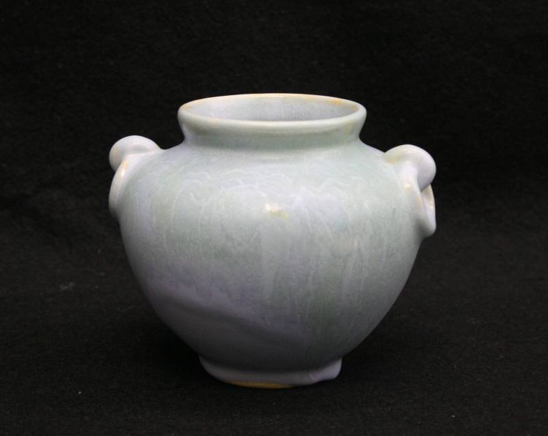 DescriptionUnusual Camark blue drip vase, green overflow, with loop handles.Has "1st Block Letter" impressed die stamp with 3/16" high black letters.Status