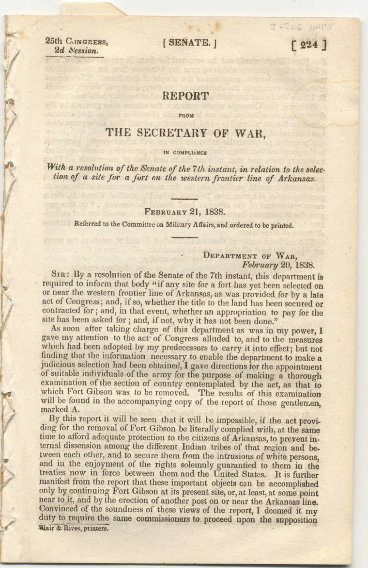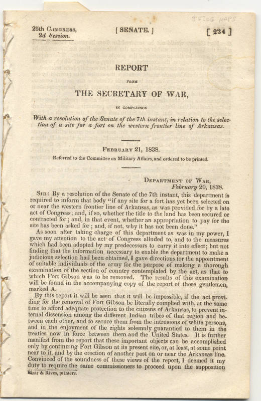 DescriptionReport from the Secretary of War. 25th Congress, 2nd Session, Doc. No. 224. "In compliance with a resolution of the Senate of the 7th instant, in relation to the selection of a site for a fort on the western frontier line of Arkansas"