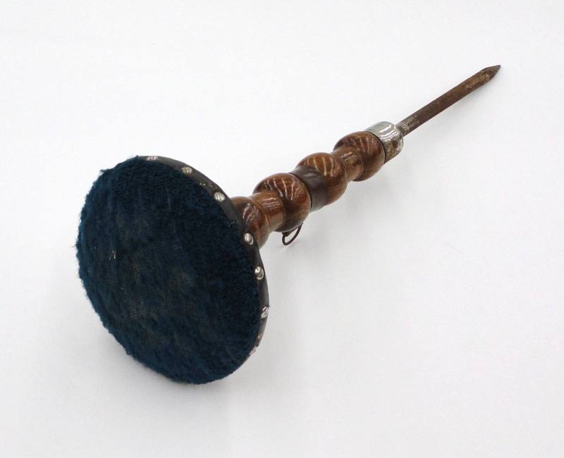 DescriptionPin cushion belonging to Ina Davis for outdoor use. Ina Davis was the wife of former Arkansas governor Jeff Davis. Davis was governor from 1901–1907.Artifact totals 2' in length. A turned, wooden base supports a round blue carpeted cushion secured by leather and brass tacks. Cushion rests upon 10" iron stake designed to support it above the ground.