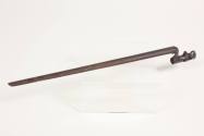 The bayonet features a tapered point constructed a curved piece of dark metal. The bayonet has a circular attachment at the base for it to be placed and secured around the muzzle of a gun.