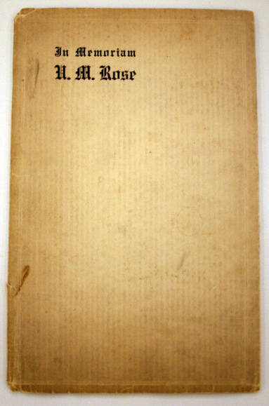DescriptionU. M. Rose Manuscript "An Episode During the Civil War". Bound book covered in black textured paper. At the center of the front cover is a maroon rectangular label with gold lettering and border. "An Episode/During the Civil War/by U.M. Rose". Manuscript is sixty-four pages long, bound along the top of the paper, typed in a Courier/typewriter font.