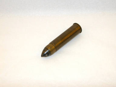 DescriptionHotchkiss artillery shell, 10 pounder, dropped - Jenkins Ferry extraction route. Conical in shape with a white oxidized band of metal (lead) along the center. The base of the shell is rounded, slightly convex, while the nose of the projectile is flat with a drilled fuse hole. The body of the shell is grooved vertically in three places.Status