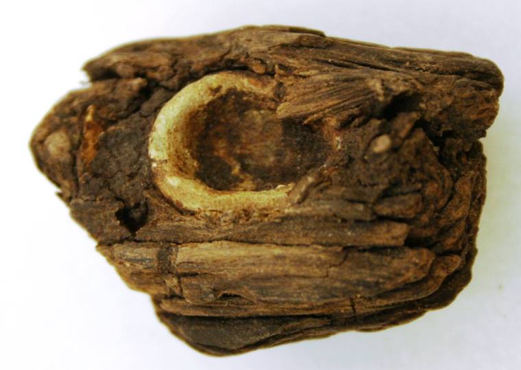 DescriptionCivil War era bullet embedded in a fragment of dark wood. The misshapen rear cavity of the bullet is exposed, presumably having been fired into a tree and later cut out as a souvenir.