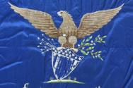 Back: The flag is bordered in blue. There is a white field with a blue medallion in the center. 43rd Regt. Illinois. Vol. Veterans. 1864. A leaf decoration is embroidered below the lettering.
