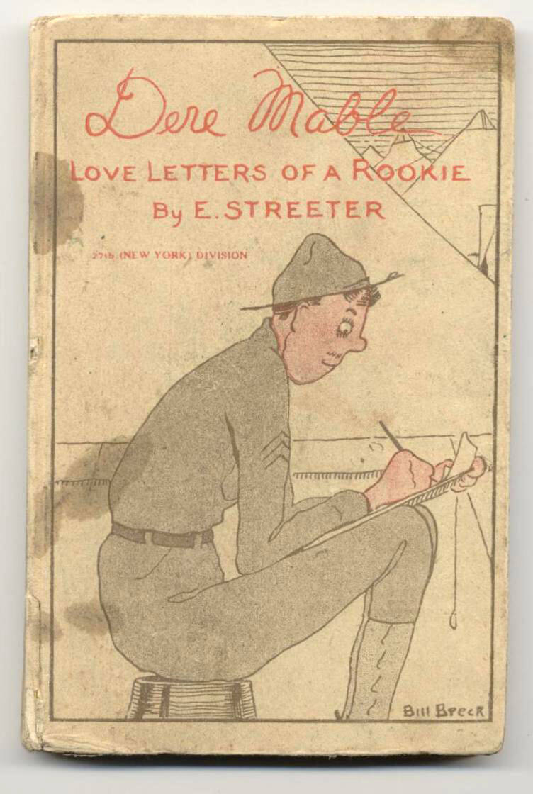 DescriptionBook - "Dere Mable: Love Letters of a Rookie" by E. Streeter (written in red text). On front of book: drawing of a soldier sitting on a bucket and writing a letter. Priced in French francs. Inside, opposite title page, is a black and white drawing of Mable. 61 pages with 3 pages of advertisements. Made of Cardboard, paper and ink.