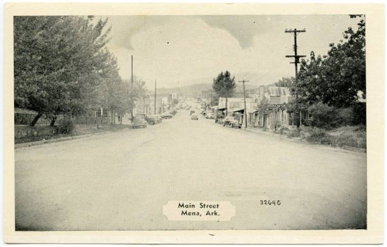 DescriptionA postcard depicting Main Street in Mena, Arkansas. The postcard features a black and white image of a street lined with buildings and trees. Text within a banner located in the lower middle section of the postcard states "Main Street" and "Mena, Ark.".