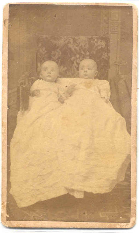 Gilbert and Lewis Davis as infants wearing long white gowns