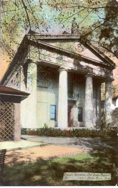 DescriptionColor drawing of the Old State House in the spring. "Arkansas War Memorial (Old State Capitol). Little Rock, Arkansas" is printed across the top in black lettering. The back is blank and there is no stamp or postmark.