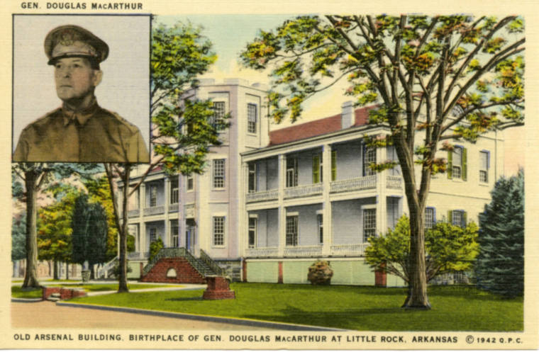 DescriptionColor postcard of the Old Arsenal Building (now the MacArthur Military Museum) in Little Rock, Arkansas. Small image of MacArthur in upper left corner of the postcard. In black lettering at the bottom of the postcard: "Old Arsenal Building Birthplace of Gen. Douglas MacArthur at Little Rock, Arkansas ca. 1942"